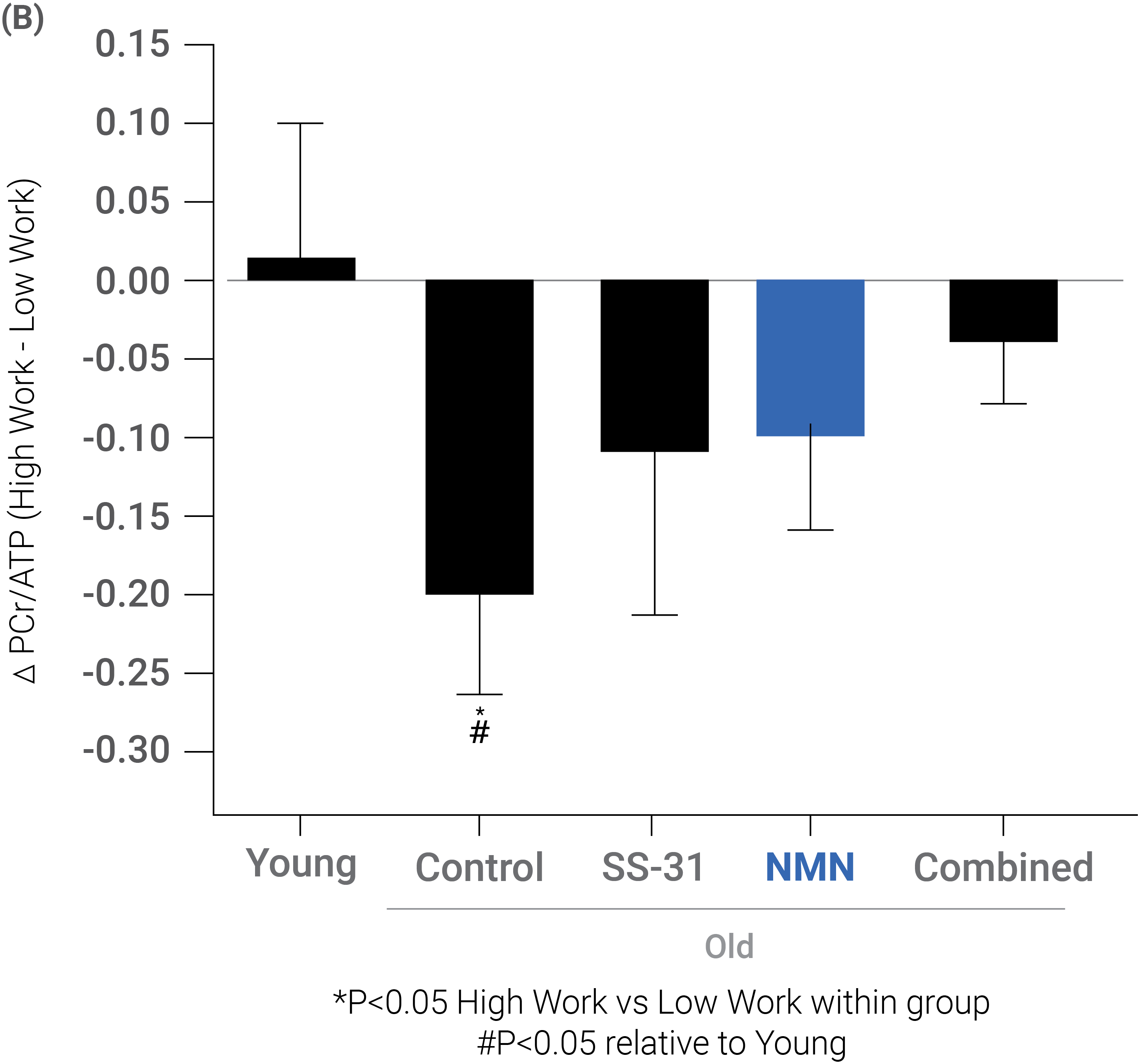 For these reasons, Whitson and colleagues tested the effects of these two mitochondrial-targeted drugs SS-31 and NMN on old mouse hearts. The investigators treated older animals with SS-31 and NMN both individually and in combination, and all treatments resulted in diminished age-related metabolic changes in cardiac function. They next measured the ratio of the metabolites phosphocreatine (PCr) and adenosine triphosphate (ATP) in the heart during experimentally-induced elevations in heart rate in these old mice. This measurement provides an assessment of how effectively the heart can respond to increased work by determining the degree to which the phosphates stored in PCr that provide energy for contraction are depleted from cardiomyocytes under increased demand for ATP.