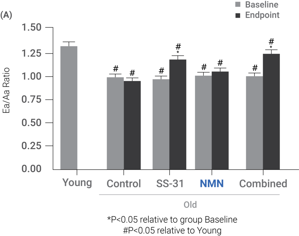 (Whitson et al., 2020 | Aging Cell) SS-31 improves the period of the heartbeat where the heart’s chambers fill with blood (i.e., diastolic function), NMN improves the period of the heartbeat where the heart pumps blood throughout the body (i.e., systolic function), and the combination improves both diastolic and systolic functions in older mice. (A) After treating old mice with SS-31, diastolic function, as represented by the Ea/Aa ratio, improved toward that seen in young mice. These improvements came with a combination of SS-31 and NMN, also. (B) After treating old mice with NMN, their systolic function, as represented by percent fractional shortening, in higher workload conditions improved to that seen in young mice. Similar results were observed with a combination of treatments.